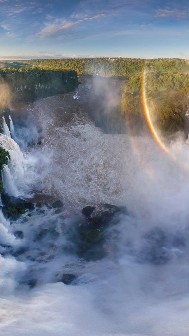 O beijo do arco-íris na cachoeira Cataratas do Iguaçu na fronteira do Brasil com a Argentina (© AirPano LLC/Amazing Aerial Agency)