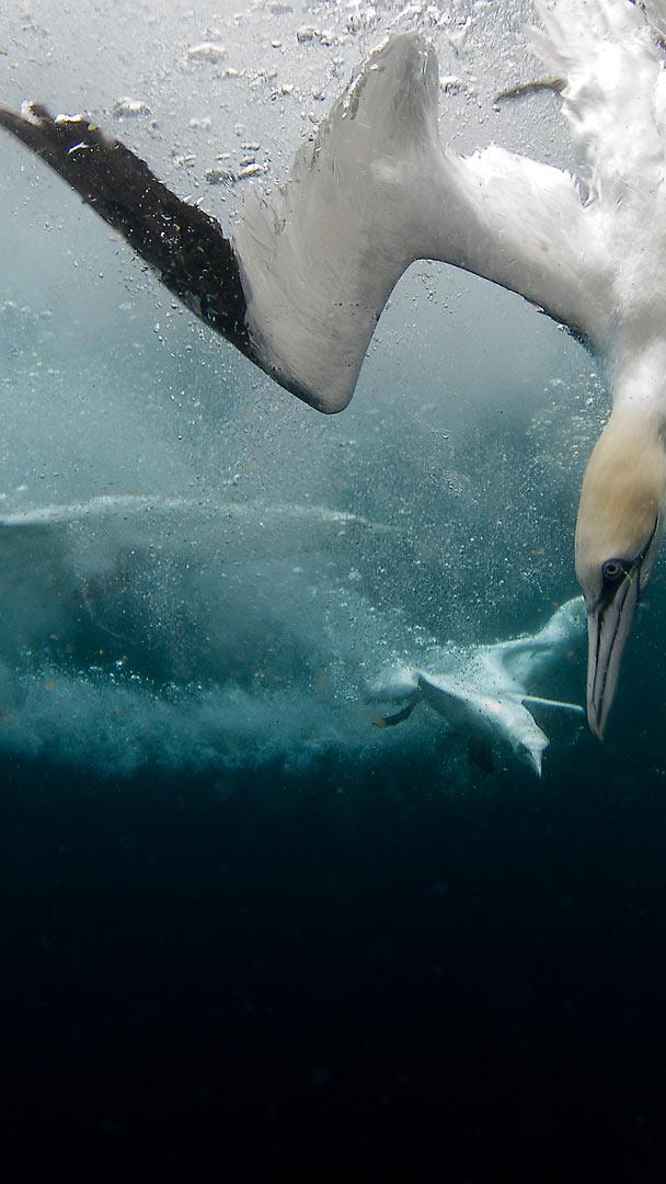 Plumas e profundezas Gansos-patola mergulhando em busca de peixes, Ilhas Shetland, Escócia (© Richard Shucksmith/Minden Pictures)