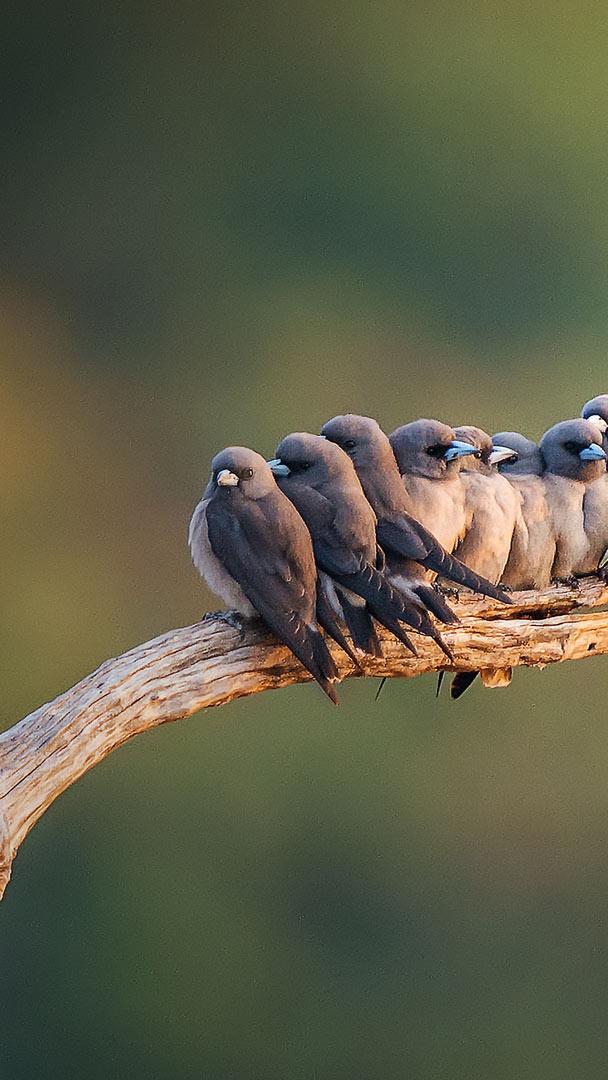 Tão juntos quanto o céu permite Família de Artamus fuscus empoleirada em um galho na Tailândia (© Captain Skyhigh/Getty Images)
