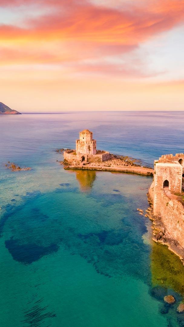 Auf einer felsigen Landzunge thront die Burg von Methoni, ein Symbol der mittelalterlichen Macht an der Küste des Ionischen Meeres in Südgriechenland. Die Festung befindet sich in Methoni, einem Dorf in der Region Messenien. Die von den Venezianern im frühen 13. Jahrhundert erbaute Burg war ein wichtiger Handelsposten und eine Verteidigungsbastion, die die südwestliche Küste vor Eindringlingen schützte. Der Bourtzi-Turm, eine Erweiterung der Festung auf einem kleinen Inselchen, war einst durch eine Steinbrücke mit der Hauptburg verbunden.