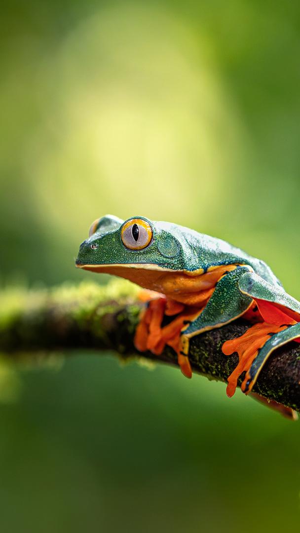 Kennen Sie dieses flinke Tier? Der Prachtgreiffrosch ist vor allem in den tropischen Regenwäldern Mittel- und Südamerikas zu Hause, insbesondere in Ländern wie Costa Rica, Kolumbien und Ecuador. Mit seiner leuchtend grünen Haut, die von gelben und blauen Akzenten durchzogen ist, ähnelt er optisch einem Blatt und zählt zu den beeindruckendsten Amphibien der Welt. Der farbenfrohe Frosch ist ein Meister der Tarnung und Anpassung. Tagsüber ruht er beinahe unsichtbar in den hohen Baumkronen, wo seine Farben perfekt mit der Umgebung verschmelzen. Nachts jedoch wird er aktiv und begibt sich auf Insektenjagd. Besonders faszinierend ist, dass die Weibchen ihre Eier auf Blätter über kleinen Wasserstellen ablegen. Nach dem Schlüpfen fallen die Kaulquappen direkt ins Wasser – eine clevere Anpassung, die Schutz vor Raubtieren bietet.