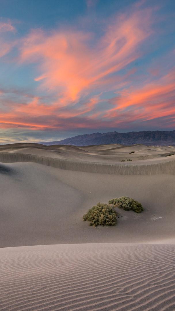 Entdecken Sie heute die Mesquite Flat Sanddünen im Norden des Death-Valley-Nationalparks im US-Bundesstaat Kalifornien. Sie sind die zugänglichsten und bekanntesten Dünen des Parks. Sie erreichen Höhen von bis zu 30 Metern, entstehen durch die Erosion der Berge im Norden, die den Sand liefern, und durch Winde, die ihn bewegen. Berge im Süden fangen den Sand ein, sodass eine beeindruckende Landschaft aus wellenförmigen Sandhügeln entsteht. Die Dünen sind nach den hier wachsenden, widerstandsfähigen Mesquitebäumen benannt und bieten atemberaubende Ausblicke bei Sonnenaufgang und Sonnenuntergang sowie hervorragende Möglichkeiten zur Sternenbeobachtung.