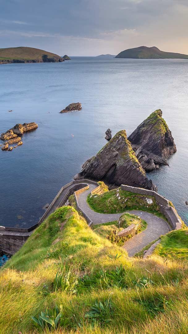 Endlos lange Strände, schroffe Berglandschaften und steil abfallende Küsten – für eine solche Traumkulisse muss man nicht ans andere Ende der Welt reisen. Diese landschaftliche Vielfalt findet sich auch in Irland, besonders eindrucksvoll an der windumtosten Atlantikküste der Dingle-Halbinsel. Dort liegt das kleine Dorf Dunquin (irisch: Dún Chaoin), bekannt für seine dramatische Küste, seine lebendige Tradition und den berühmten Dunquin Pier – ein Ort, der wirkt, als sei er einem Film entsprungen. Der kleine Anleger ist nur zu Fuß erreichbar und berühmt für seinen serpentinenartigen Pfad, der sich spektakulär die Klippen hinabwindet. Heute zählt er zu den meistfotografierten Motiven Irlands. Von hier aus fahren Boote zu den abgelegenen Blasket Islands, die einst Heimat von Fischern und Schriftstellern waren. Dunquin ist die westlichste Siedlung Irlands und Teil der Gaeltacht, in der bis heute Irisch gesprochen wird.
