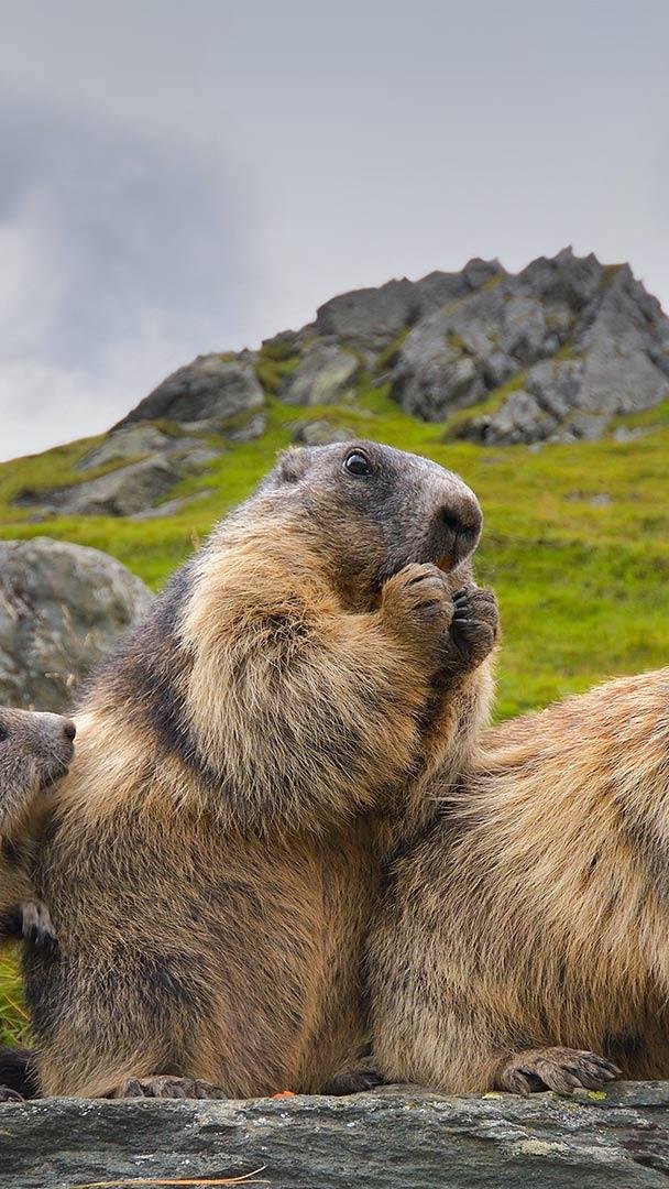 Der Frühling kommt Alpenmurmeltiere im Nationalpark Hohe Tauern, Österreich (© Michaela Walch/Alamy)