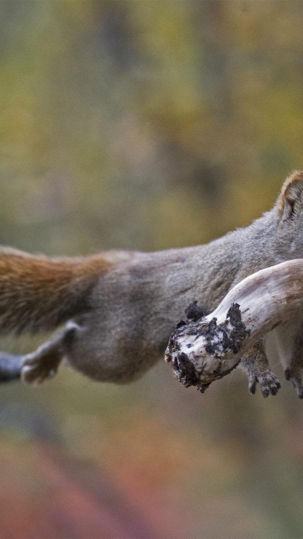 Hier kommt das Abendessen! Eichhörnchen beim Transport eines Pilzes (© Michael Quinton/Minden Pictures)