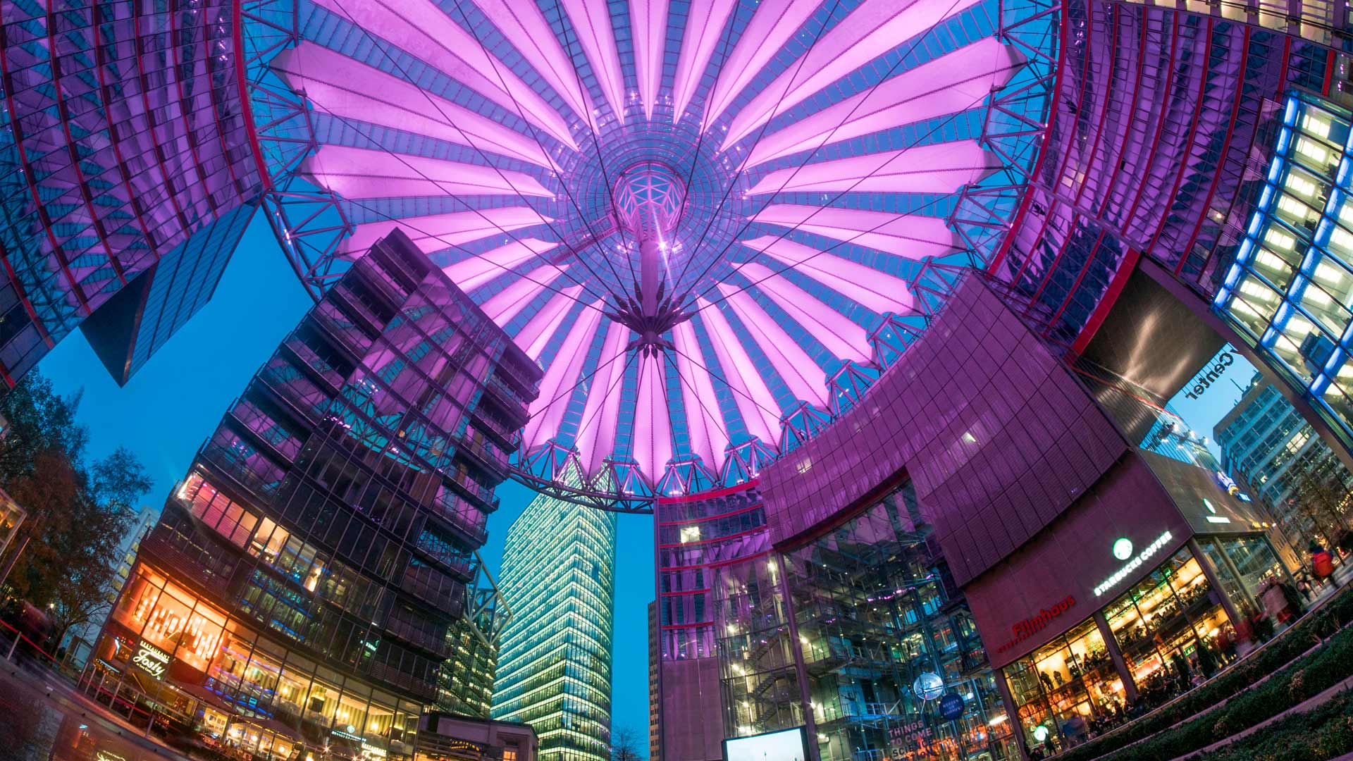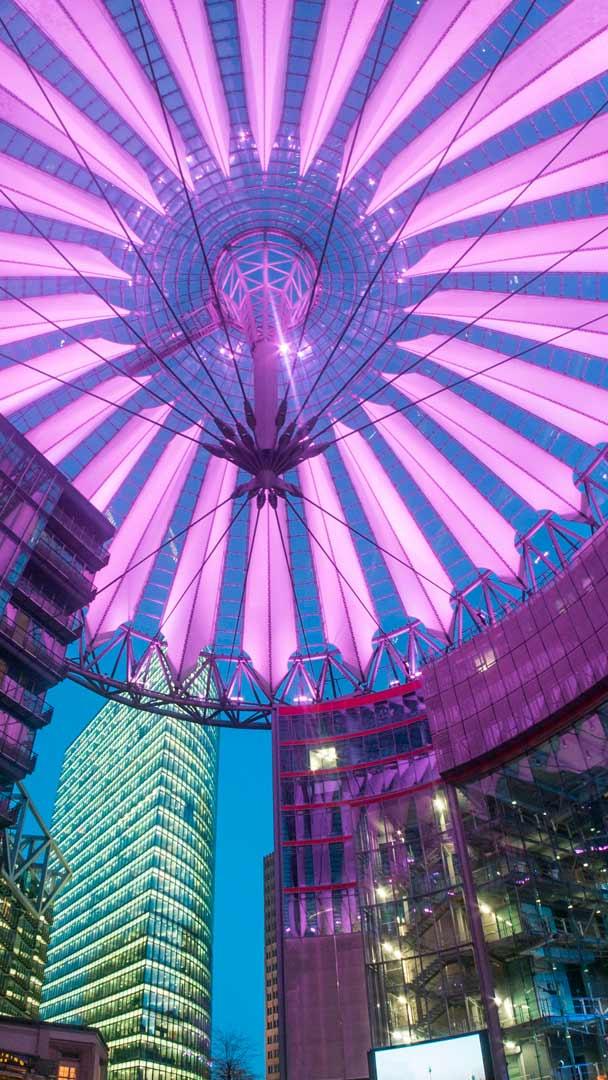 Architektonische Perfektion Beleuchteter Innenraum, Sony Center, Berlin (© travelstock44/Alamy Stock Photo)