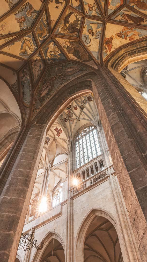 Au sommet d’un promontoire dominant Kutná Hora, en République tchèque, à 70 km à l’est de Prague, la cathédrale Sainte-Barbe déploie ses arcs gothiques comme des ailes prêtes à s’envoler. Dédiée à la patronne des mineurs, elle raconte l’âge d’or d’une ville façonnée par l’argent. Commencée en 1388, son chantier s’étira sur des siècles, au gré des fortunes minières. D’abord rêvée gigantesque, elle dut se contenter d’un plan réduit lorsque les filons s’épuisèrent.
