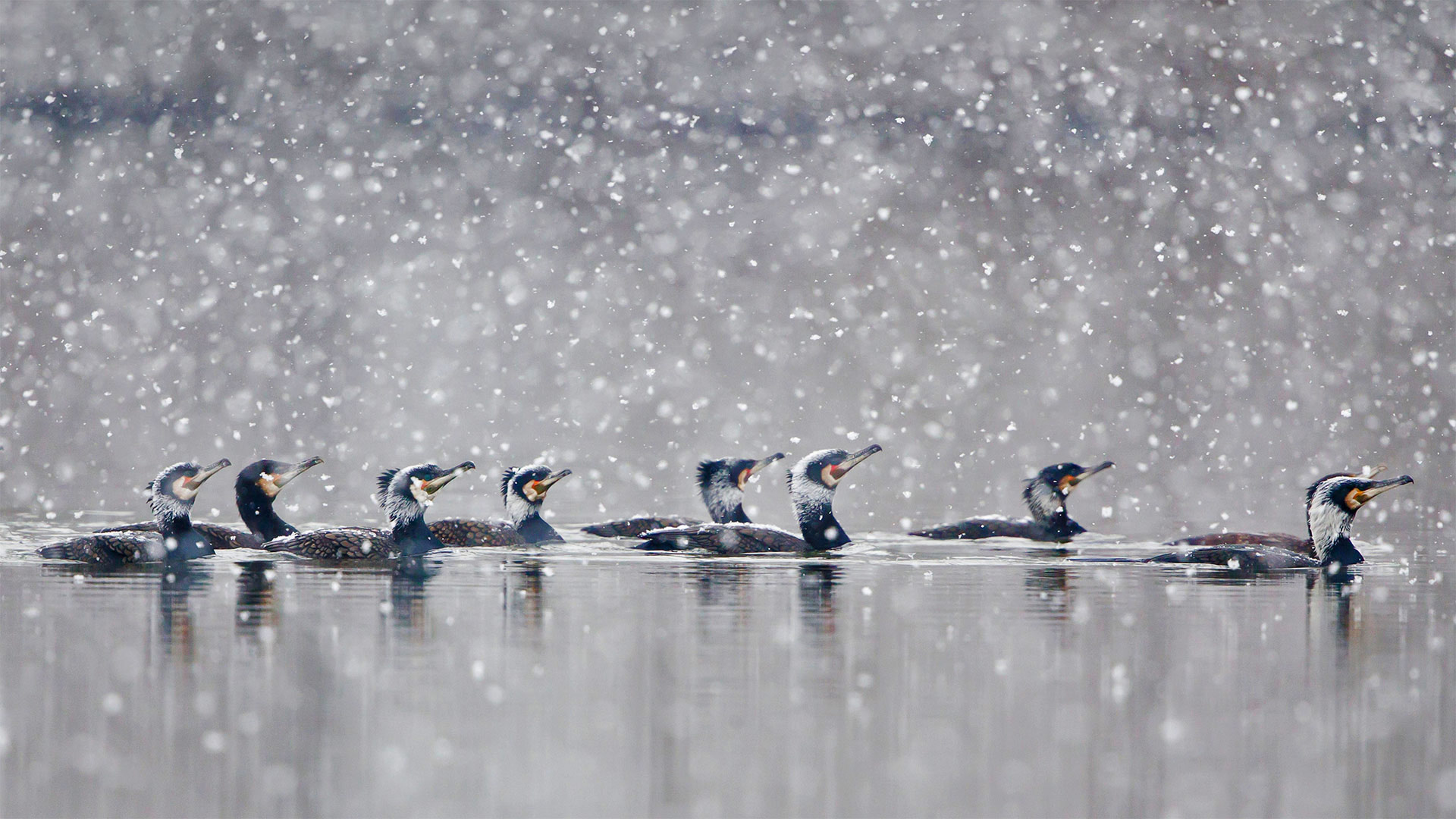 What are these beautiful birds? Great cormorants gliding through a snowstorm in Hesse, Germany (© Wilfried Martin/Getty Images)