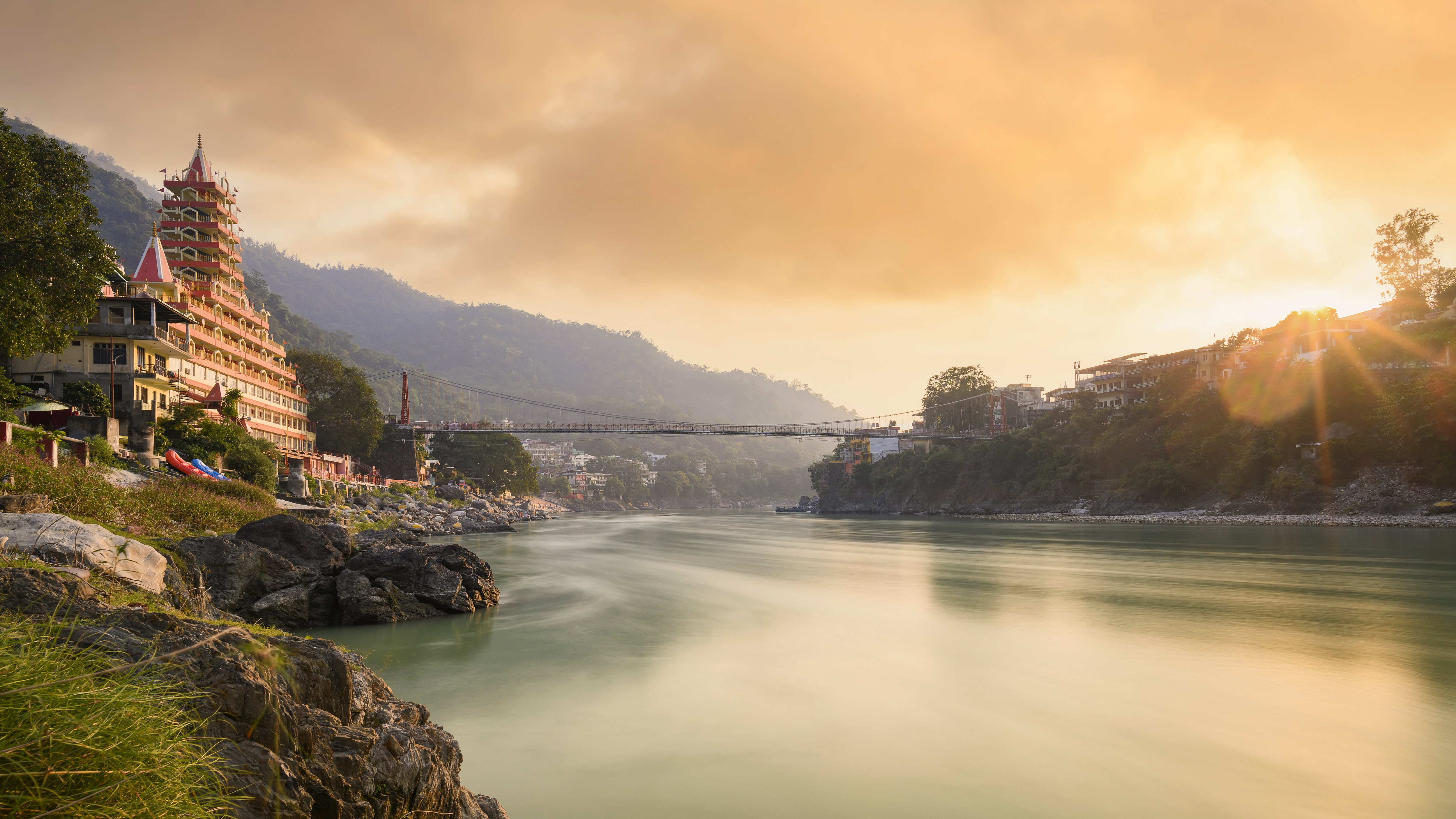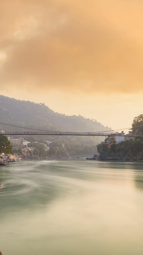 Welcome to the worlds yoga capital Ganga river, Lakshman Jhula, and Tera Manzil Temple in Rishikesh, India (© Travelwild/Shutterstock)