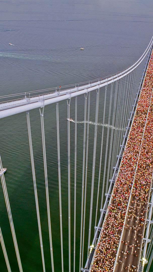 Di corsa lungo il ponte Maratoneti sul ponte Verrazano-Narrows, New York City, Stati Uniti (© David Madison/Getty Images)