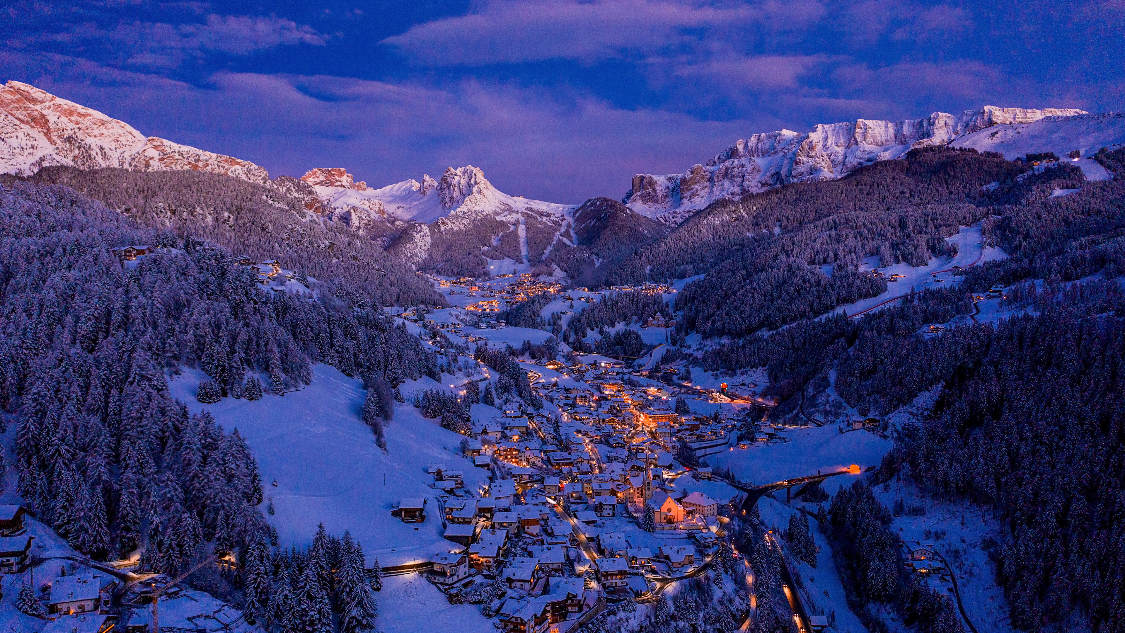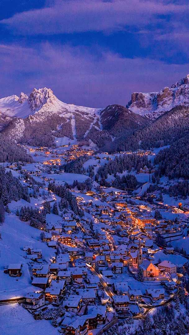 Spettacolo notturno tra le cime della val Gardena Villaggio in Val Gardena durante il Natale, Dolomiti, Trentino-Alto Adige (© Ingus Kruklitis/Getty Images)