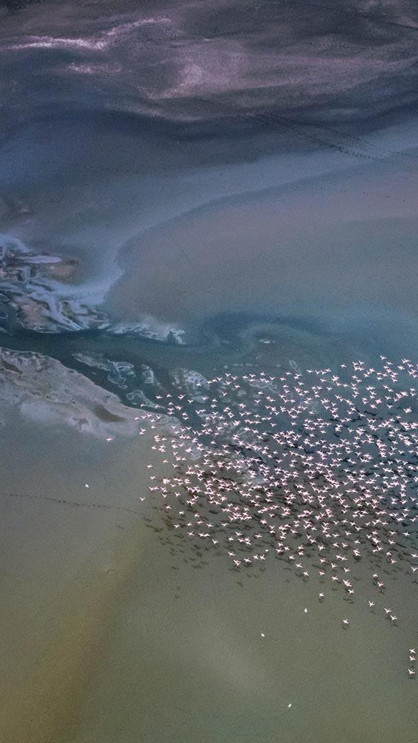 Un’occhiata dall’alto Fenicotteri minori che volano sul Lago Magadi, Kenya, Africa (© Vicki Jauron, Babylon and Beyond Photography/Getty Images)