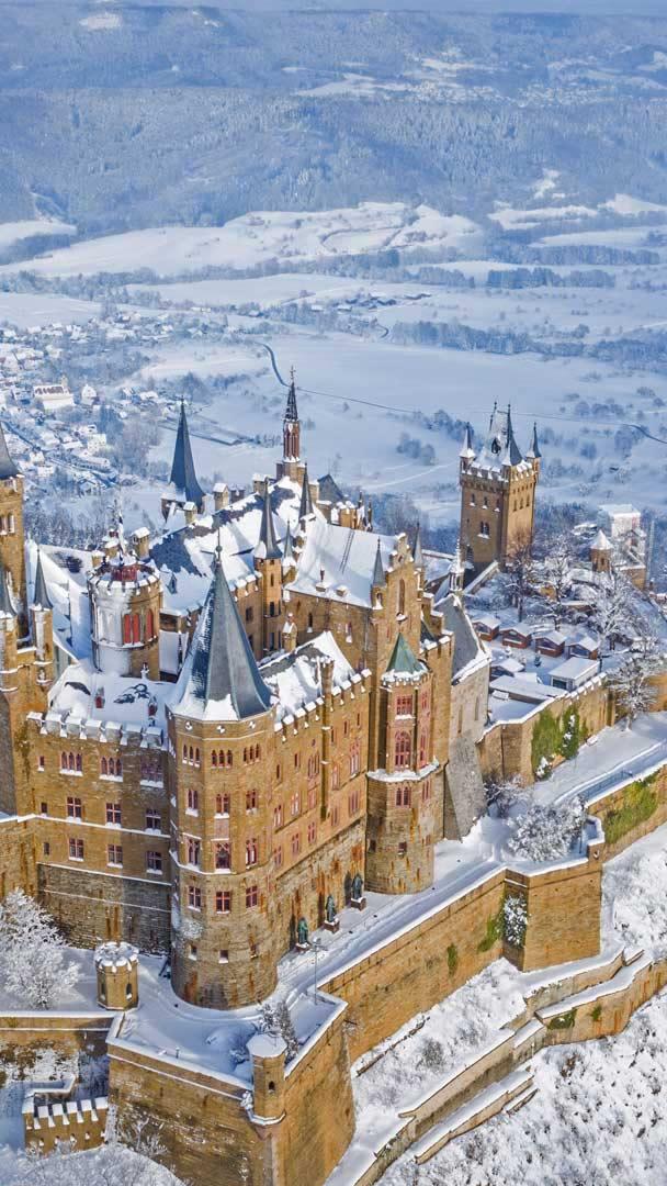ドイツ 雪に覆われた山頂の城 ホーエンツォレルン城, ドイツ (© Sahara Prince/Shutterstock)