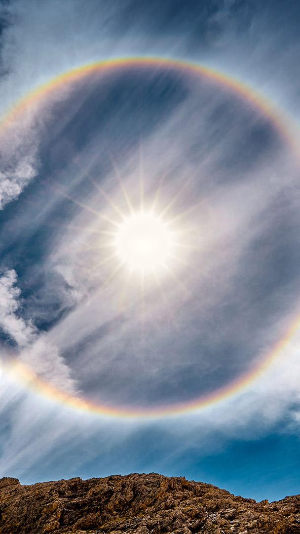 The days only get longer from here! The Northern Hemisphere marks the beginning of winter today, but the winter solstice is also the shortest day of the year. The rainbow that encircles the sun in our image, a sun halo, is above Lake Antermoia, in the Dolomite Mountains of northern Italy. Sun halos form when sun or moon light shines through ice crystals suspended in the upper atmosphere. When the light of the sun hits the crystals they serve as a prism, separating the light into individual colors of the spectrum, the same way rainbows occur after a rain shower.