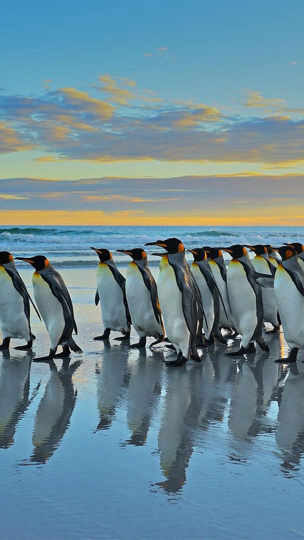 We"re celebrating Penguin Awareness Day in the Falkland Islands, taking a stroll with some king penguins. Kings are the second-largest penguin species, only outranked in stature by their emperor penguin cousins. And while the kings" tuxedo coloring gives them a dash of the debonair, it also provides an important and more practical purpose: camouflage. When the birds dive deep into the ocean looking for food, their black feathers disguise the birds from predators above, while their white undersides do the reverse. Kings are legendary for their diving prowess—in their quest for tasty squid and lanternfish, they can dive to depths of 300 feet, and some have even been spotted nearly 1,000 feet beneath the surface. Underwater, these flightless birds are the epitome of grace. On land, however, they are not so graceful, and waddle or "toboggan" on their bellies to get around.