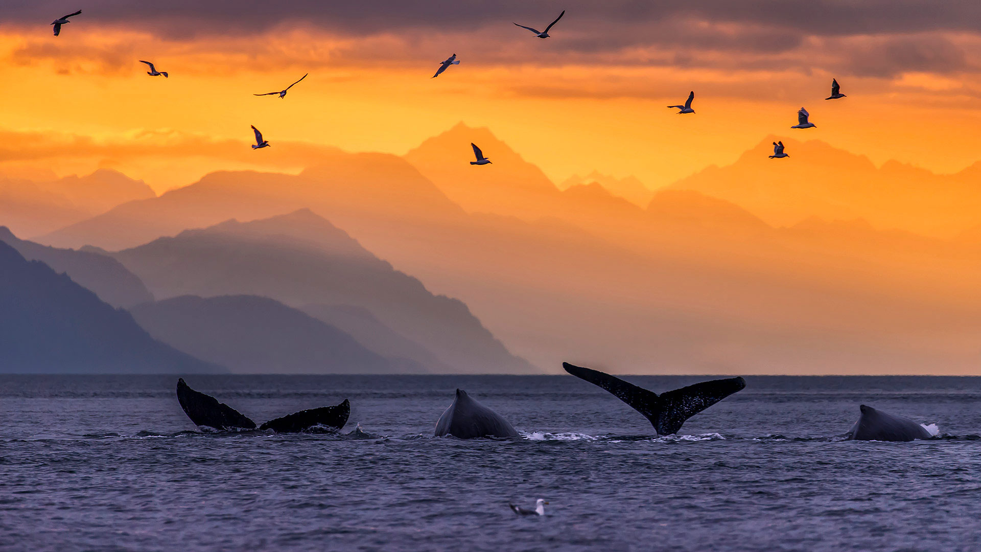 Humpback whales are found in virtually all the world’s oceans, though they don’t swim in the extra-cold waters of the Arctic. This pod is breaching the surface of Lynn Canal in the Alaska portion of the Inside Passage, where the whales return in summer for the feeding season after sensibly wintering in warmer tropical waters.