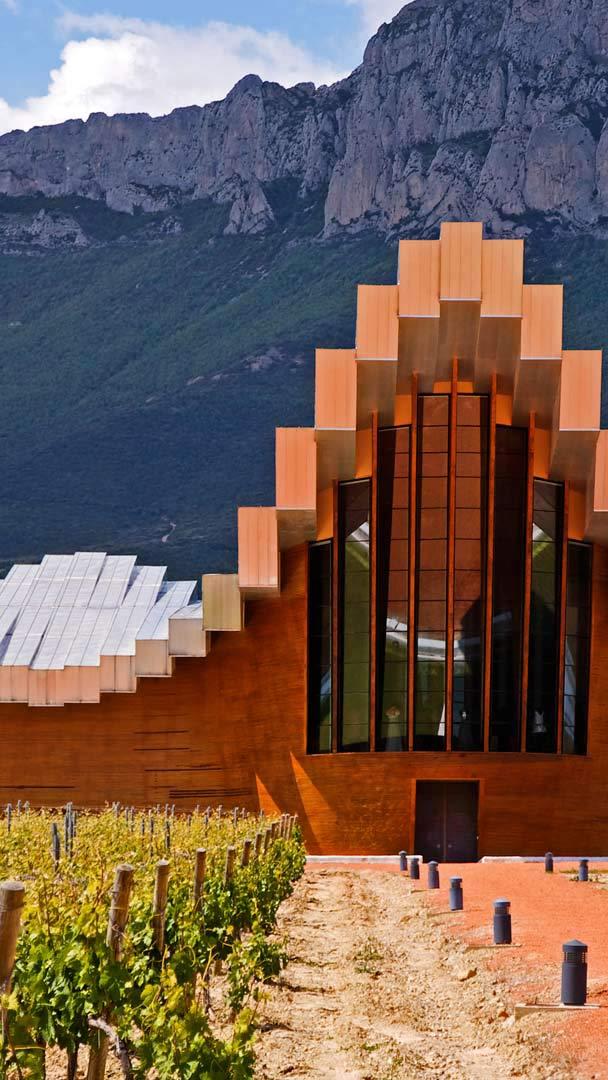 This pixelated-looking building is home to a boutique winery in the Rioja region of northern Spain. Inside, the Bodegas Ysios produces red wine from Tempranillo grapes grown in the area. The building itself was designed by Spanish architect Santiago Calatrava to echo the outline of wine barrels lined up in a row. Out here in the foothills of the Sierra de Cantabria, it creates a memorable contrast with the rustic environment.